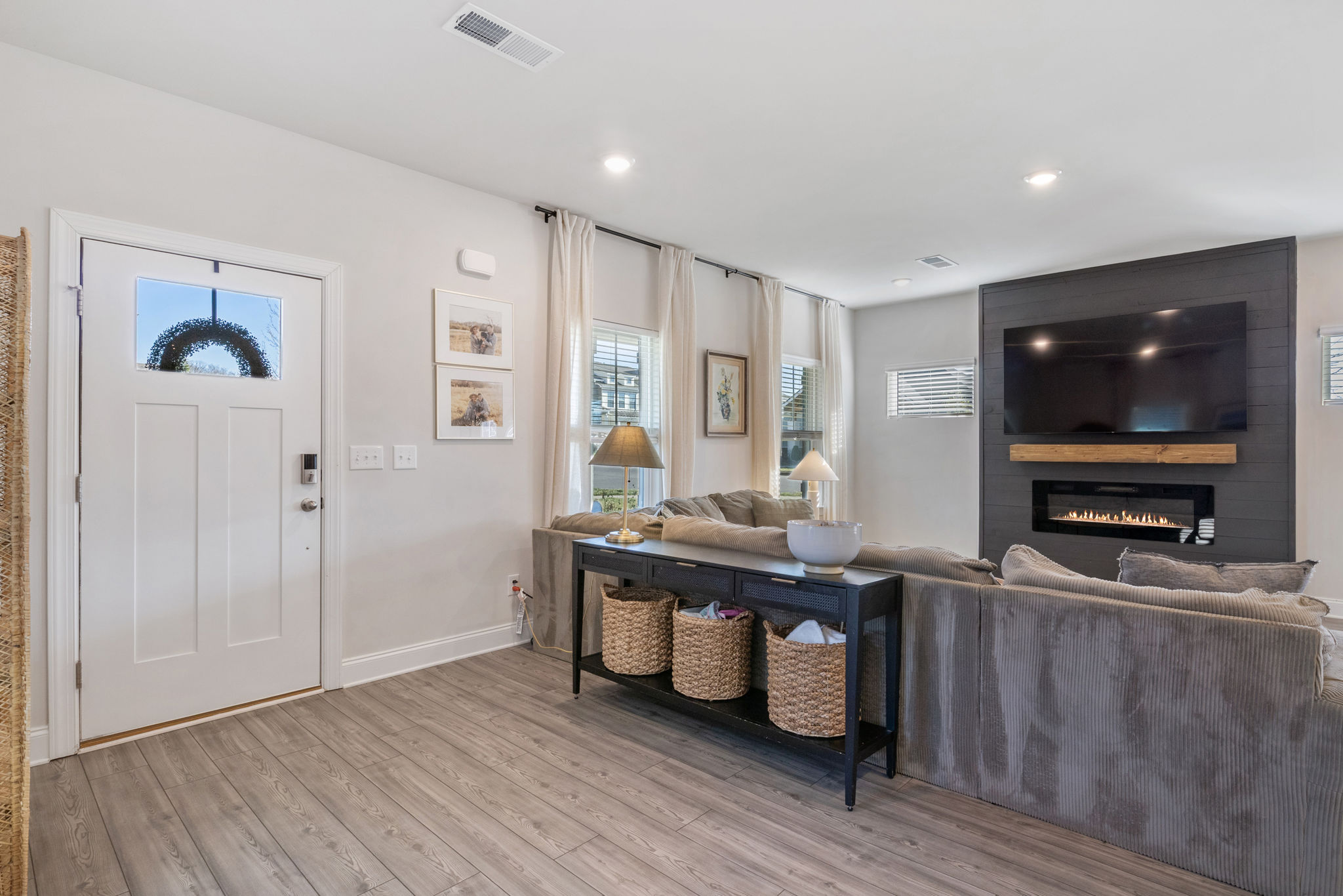 • Custom Fireplace: Accented with shiplap and a wooden mantle